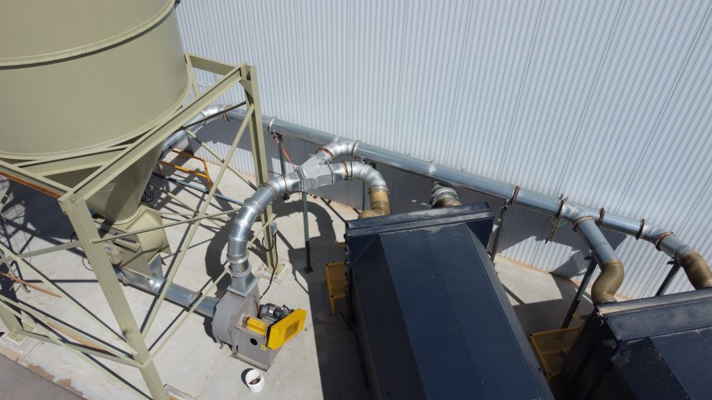 Depending on the manufacturing process, would can often create large volumes of waste, which if not properly planned, can lead to a lot of maintenance. Pictured here, is a rotary air lock featuring a closed loop system with a material handling transfer fan and a two-way diverter pushing waste into transportable waste containers. The waste is then used to create mulch and animal bedding products.